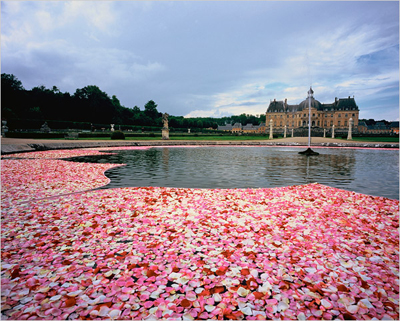 奧斯特為法國沃勒維孔城堡一個私人派對設計的水池景觀,紅、白、粉色的玫瑰花瓣漂浮在水面。