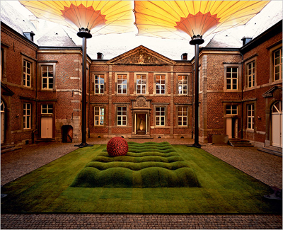 似乎為了平衡這種死亡帶來的壓抑,奧斯特也偶爾設計一些輕的景觀作品。比如他為比利時奧德·彼圣城堡(Alden Biesen)設計的園林中,灌木叢被他修剪成起伏的水波狀,精密設計的幾何對稱與古老的城堡渾然一體,同時又賦予其現代感。又如他為法國沃勒維孔城堡(Chateau de Vaux le Vicomte)一個私人派對設計的水池景觀,紅、白、粉色的玫瑰花瓣漂浮在水面,組成一連串更大的花瓣形,環繞池塘四周,仿佛為它裝上了一條美麗的裙邊。