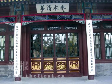 今“清華園”工字廳后面的匾額題“水木清華”四字,兩旁有對聯一副,曰:檻外山光歷春夏秋冬萬千變幻都非凡境;窗中云影在東西南北去來澹蕩洵是仙居。“水木清華”四字典出晉謝叔源的《游西池》詩,“景昃鳴禽集,水木湛清華。”“湛”為澄清之意。因工字廳后有池,故有謝氏詩句,題為“水木清華”。
