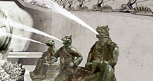 海晏堂前兩條一米來長的大型吐水石魚,每只魚嘴里流出的水分別沿左右兩邊的水道向前流,最后與生肖獸頭中噴出的水一同匯合在海晏堂前扇形的水池中。這些獸頭人身的生肖,頭為青銅,身為石質,中空連接噴水管,每隔一個時辰各司一次職,從時辰代表者的口中噴出長長的水流直射入池中的雕像;而每當正午時分,12生肖像口中同時噴射水柱,堪稱計時、園林和雕塑中的奇觀。