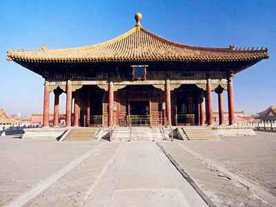 1644年(崇禎十七年),李自成軍攻陷北京,明朝滅亡。李自成撤退前焚毀紫禁城,僅武英殿、建極殿、英華殿、南熏殿、四周角樓和皇極門未焚,其余建筑全部被毀。同年清順治皇帝從沈陽遷都至北京。此后歷時14年,將中路建筑基本修復。