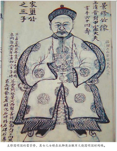 英法聯軍火燒圓明園時,燕雷氏帶領全家老幼共14口,集體自焚,殉難盡節