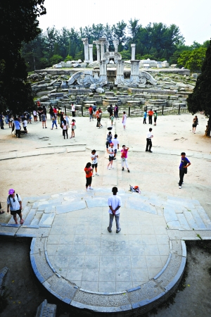 (采用“C羅式劈腿站立法”的)游客所立之處原為皇帝在圓明園觀看水法的席位。噴泉全部開(kāi)放時(shí),“聲聞里許”,近處談話時(shí)需要借助手勢(shì)。水聲滔滔、水霧氤氳、平日里拉著長(zhǎng)臉的皇帝也會(huì)隨之手舞足蹈……