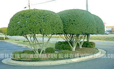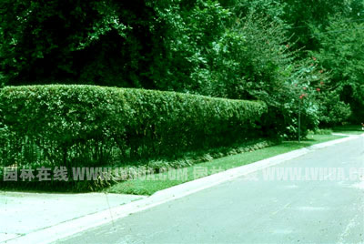 蠟楊梅具有良好的萌辟性,耐修剪,可以修剪成球形、蘑菇型、方形等各種形狀(如圖6),與各景觀小喬木或高大喬木搭配種植。可以根據需要塑造出各種富有藝術性的植物雕塑景觀,為公園、私家庭院或街頭綠地增添熱鬧氣氛。 2、綠籬運用: