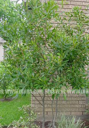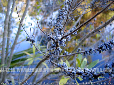 蠟楊梅:學名Myrica cerifera,別名:蠟香桃木,楊梅科楊梅屬。系常綠小喬木,高2-3米,越往南方植株越高可超過5米(如圖1),越往北方植株生長就比較矮小;全株有香氣,葉蠟質有光澤,新葉翠綠色彩鮮艷(如圖2),葉背布滿黃色小腺點,揉搓有濃烈香氣,具有提神醒腦的功效;果藍色(如圖3),冬季不落,果實直徑3mm左右,外包厚厚的蠟層,可用做蠟燭的原料。葉子和果實具有藥用價值。放在櫥柜或抽屜中,用于驅蟲。蠟楊梅株形優美,枝繁葉茂,耐修剪,不僅可以做小喬木觀賞,亦是可修剪成球形,園林用途廣。