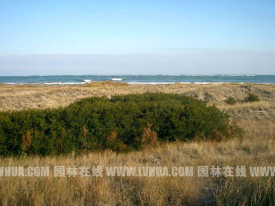 蠟楊梅喜光,也耐半陰,喜溫暖濕潤氣候,具有一定耐寒性,其耐鹽堿、耐旱、耐水濕,適生于沿海地區和沼澤地(如圖4、圖5),適應性強,分布緯度跨度范圍大,適合生長范圍為植物生境區7—11,在美國幾乎覆蓋了所有的沿海地帶,分布極為廣泛。 二、在園林綠化中的運用 1、球形運用: