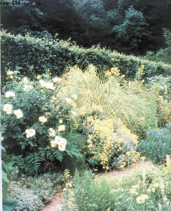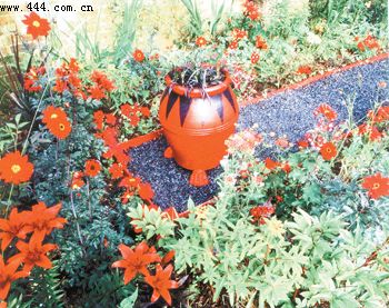 ![]() ▲紅色熱烈奔放,充滿激情和力量。很多人不敢輕易在設計中使用紅色,但是紅色的花卉與綠色植物搭配絕對會讓你備感親切自然。專家指出,紅色容易吸引人們的注意力,因此,最好將其安排在植物景觀的中間且比較靠近邊沿的位置,而不要設置在隱蔽的角落邊沿或距離視線較遠的地方。圖為紅色花卉、小品與綠色植物形成艷麗的景致。 ![]() ▲黃色華貴雍容。在專家們看來,黃色同樣是非常醒目的顏色,但是,卻會使人緊張不安,情緒躁動。因此很少會有人將其大量應用在花園內,一般多做色彩點綴。圖為黃色為主色調的花園。