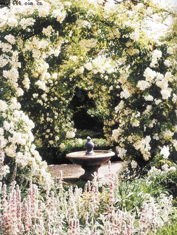▲白色 純凈高雅。專家表示,不要一看到白色就聯想到有人故去,而且,不必擔心將白色充滿整個空間會讓人有不舒服的感覺。事實上,設計制作一座白色的花園是很有趣的構思,白色可以喚起人們對和平和簡單生活的渴望。小型的白色花朵在與其他色彩組合時,可以起到提升局部景致的作用;而大片白色植物的使用,將給人強烈的沖擊感。圖為以白色花卉構建的花園。