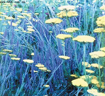 ▲藍色給人安靜深邃的感覺。專家認為,最好不要將這一顏色的花卉單獨成片栽植。與其他色彩相比,藍色更加需要與其他色調進行搭配,如在其中零星栽種深紅色植物,或與帶狀杏黃色或淺黃色花卉間植,又或在旁邊栽種大片白色花卉進行對比。圖為黃色與藍色組合形成非常醒目的景致,若將黃色替換成銀色、粉色或乳白色均可達到相同的效果。