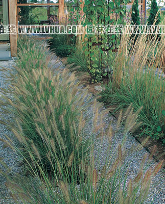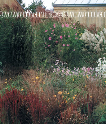 與觀賞草的合理配置 一年生和多年生花卉與幾種觀賞草一起,形成錯(cuò)落有致的繽紛花帶。