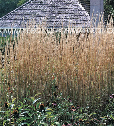 美麗的花境 狼尾草和金光菊互相比照,形成優(yōu)雅嫻美的景觀效果。 觀賞草群植景觀 山邊,大快面的‘晨曦芒’和一些多年生花卉組成強(qiáng)烈、振撼的群植效果,壯美而引人注目。
