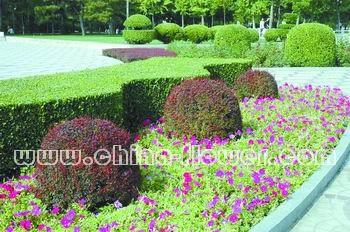 河南省鄭州市碧沙崗公園的南門廣場,有幾個用紫小檗修剪而成的灌球,造型豐滿,紫紅色的葉子色彩靚麗,與開著粉紅色花的地被植物矮牽牛相映成趣,在不同造型的綠色大葉黃楊景觀樹的映襯下格外醒目。