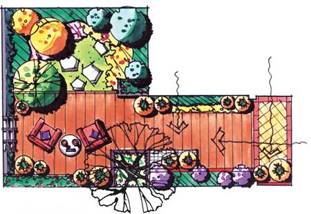 搭配方案四: 基礎花園:L形(休閑區大于植物區)。 推薦花材:花葉玉簪、隨意草、叢生福祿考、苔蘚地被、香雪球。