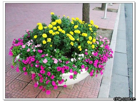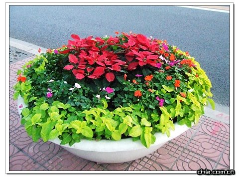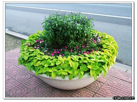 路邊的花壇均勻分布于道路兩側,為行人增添樂趣,令人賞心悅目。主要植物配置材料有:鼠尾、鳳仙、金甘薯、萬壽菊、彩葉草等。