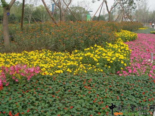 下圖為鮮花港萬(wàn)壽菊的應(yīng)用效果,萬(wàn)壽菊顏色比較鮮艷,在植物配置過(guò)程中,給顏色偏灰的色塊提亮,另外,與紅色的一串紅、玻璃海棠搭配,色彩更加鮮明,靚麗。