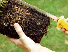 4.將植物從花盆中取出來,如果根系抱得很緊(肉質根可能會更明顯),可以用專用的根部修剪鋸或者帶鋸齒的刀從四面和底部輕輕劈開根球。這樣能刺激植物更好地在花壇中扎根。