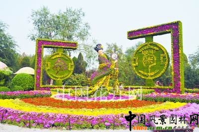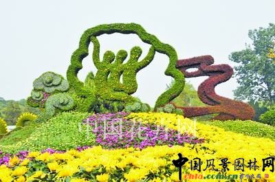 菊花是我國傳統十大名花之一,并與梅、蘭、竹一起被稱為“四君子”。將菊花應用于花壇制作園林景觀,其方式多樣,效果出眾,可與多種植物組合搭配。本文以第十屆中國菊花展覽會暨中國開封第28屆菊花花會為例,介紹如何用菊花搭建亮麗景觀。 “華彩菊頌”景區運用自然空間的巧妙處理,將主景和襯景的造型技藝表現得惟妙惟肖。景區以“華彩菊頌”為主題,展區中央一位“衣飾”華貴的古代仕女手持菊花顧盼生輝,傳神的表情表現出對菊花的眷戀之情;▔跃栈ń柚Ⅲw造型的應用,營造菊文化中詩情畫意的意境,同時也展示了菊花開花穴盤苗這一栽培新技術。 “菊香蓮城”景區,充分利用立面與平面圍合的展區,將立面布置成以大型展示屏為載體,以菊花墻為襯托的大背景,展示了東方紅廣場鄉情群雕、君子蓮廣場夜景、河東新城區等“三景”。平面用菊花塑造出“一江四岸”城區圖,展示了湘潭地理特色。紅石、白石、烏石“三石”分立景中,彰顯以毛澤東、齊白石、彭德懷等為代表的湘潭人所具有的“菊節”、“菊骨”與“菊氣”。 “東方之韻”景區,充分利用展區空間在立面上采用紅、綠草將上海世博標志勾勒出來,在平面上是用紅、黃、紫、粉色等色彩的小菊形成的色帶表示奔騰不息的黃浦江水。通過平面構圖和立面上的造型結合,展現了世博會舉辦地———上海這座城市的魅力與韻味! “菊香秦淮”景區表現的是秦淮河的碧水微瀾,河面上的游舫穿行,青磚小瓦馬頭墻的秦淮風光。搭配以婉轉流長的菊花帶,紅葉秋色,綠意襯菊。讓人宛如置身于這江南錦繡之邦,金陵風雅之藪,美稱十里珠簾的秦淮河上。大紅燈籠,煙籠寒水,槳聲燈影,紗燈紅透水邊窗。這正是:“金絲掛月泊秦淮,槳聲燈影菊花香”。