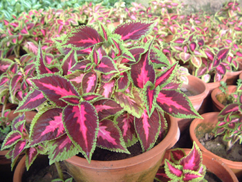 學 名: Coleus blumei 別 名: 老來少、五色草、錦紫蘇 科 屬: 唇形科鞘蕊花屬 類 別: 多年生草本植物--觀葉類 株高50~8Ocm,栽培苗多控制在3Ocm以下。 全株有毛,莖為四棱,基部 木質化,單葉對生,卵圓形,先端長漸尖,緣具鈍齒牙,葉可長l5cm,葉面綠色,有淡黃、桃紅、朱 紅、紫等色彩鮮艷的斑紋。頂生總狀花序、花小、淺藍色或淺紫色。 小堅果平滑有光澤。 產地分布 : 原產于亞太熱帶地區。現在世界各國廣泛栽培。 用途: 單獨觀賞彩葉草,其外貌并不驚人,但是它耐修剪、發枝旺、顏色艷。 成片栽種彩葉草,特別是在將其進行組字或造型時,卻能夠給人以很強的視覺沖擊力,因此適合作為毛氈花壇的裝飾材料。 適用于栽植各式平面或立體花壇,既可與草花搭配栽植各式模紋花壇,又可單獨拼字、拼圖案,栽植人物、動物、吉祥物或物體造型、大型廣告宣傳造型、雕塑等,還有和雕塑、噴泉等組合而成的混合式花壇。 還有采取立體與平面相結合的各項花壇,這樣設計栽植的花壇立體感強、彩化效果突出。 顏色隨著季節、天氣和養護技術的變化而變化,彩化效果十分突出。這是其他任何花卉不可比擬的。 彩葉草的嫩葉也可以食用,將其清炒,口味頗佳。 彩葉草變種品種: 五色彩葉草(Var· verschaffel訊)葉片有淡黃、桃紅、朱紅、暗紅等色斑紋,長勢 強健。 黃綠葉型彩葉草(ChartreuseTyPe)十小黃綠色,矮性分枝多。 皺邊彩葉草(FringedTyPe)邊緣褶皺. 波皺大葉型彩葉草(Large-LeavedType)具大型卵圓形葉,植株高大,分枝少,葉面凹凸不平。 各種葉型中還有不少品種,并且仍在不斷地培育新品種,使彩葉草在花卉裝飾中占有重要地位。
