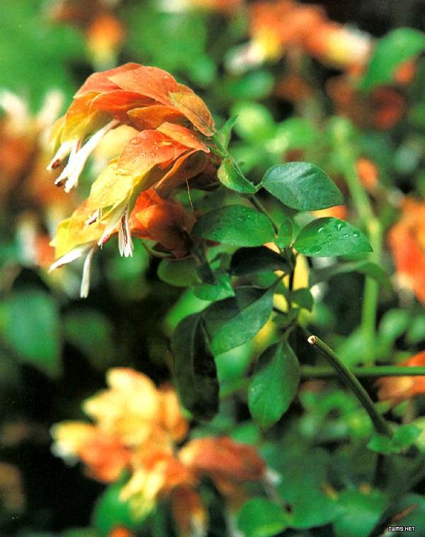 蝦衣花 狐尾木 蝦夷花 別名: 狐尾木、蝦夷花 科屬: 爵床科麒麟吐珠屬 原產地: 墨西哥,世界各地多有栽培。 生長習性: 喜溫暖濕潤,喜光也較耐陰,不耐寒。 形態特征: 葉對生,卵形或長橢圓形,先端尖,質地柔軟,表面較粗糙,全綠,淡綠色。穗狀花序頂生、下垂,苞片多數而重疊,形似蝦衣,呈磚紅至暗紅或黃綠色,為主要觀賞部分,花冠細長,超出苞片,唇形,白色,下唇瓣喉部有紫色斑點,全年開花,不易結實。 蝦衣花蒴果不易成熟,種子難得,罕用播種繁殖。常用扦插繁殖,除炎夏外,其它季節均可進行,以春秋最適。一般于6月花后,結合整形修剪,剪取粗壯充實的枝條為插穗,長10cm,插于沙床中,在20—25℃下,約半月后生根,次年即可開花。 蝦衣花的叢生性較弱,新梢往往容易徒長,株姿松散,著花少,因此應適時短剪,適度摘心,養成低矮而緊湊的株姿,多年生老株還可設架綁扎。 每年春季結合短剪翻盆換土一次,可用素沙土、腐葉土、草炭土及少量腐熟的農家肥配制,混勻上盆。高溫時節適度遮陰、降溫。經常保持盆土濕潤,全年追肥4次至5次。10月初移入高溫溫室越冬,光照要充足,室溫不可低于16℃,如入低溫溫室則生長停止而進入休眠。家庭養花,冬季室內常因溫度忽高忽低,空氣干燥,致使植株大量落葉,注意禁肥控水,保持盆土微潮,來春進行強修剪,保存宿莖,可重新萌發新枝。 溫室生長期間易遭介殼蟲、紅蜘蛛危害。 用途: 常盆栽供室內觀賞,也可布置花壇。