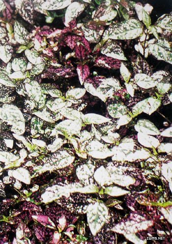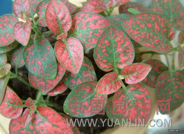 學 名: Hypoestes phyllostachya 別 名: 鵑淚草、粉露草、煙紅蔓、紅點草、紅點鯽魚膽 科 屬:爵床科 嫣紅蔓屬 產地:原產于馬達加斯加 特征: 嫣紅蔓株高可達30公分左右,但盆栽種多控制在10-15公分以內,葉對生,呈卵形或長卵形,葉全緣,葉面呈橄欖綠,上面布滿紅色、粉紅色或白色斑點。春季能開花,為淡紫色小型穗狀花序. 習性: 部分遮蔭或部分光照,適溫15-18℃。喜溫暖、濕潤和半陰環境,適宜深厚肥沃、透水、富含腐殖質的土壤。 繁殖方法用播種及扦插兩種: 播種的適期在春、秋兩季,發芽適溫約20~24℃,約5~10天后發芽,生育適溫約15~25℃。扦插栽培的成活率高,剪取頂芽或枝條,每段2~3節,插于砂床中,保持濕度,扦插期間用速大多稀釋1000倍每十天噴灑一次促進發根,約3~4周后能發根。 栽培: 栽培環境以半日照、避免陽光直射、通風良好的場地最佳,注意如過分陰暗會導致徒長,葉面斑點會逐漸淡化。 嫣紅蔓的生長相當快速,須常摘心促使側枝發生,且植株也會較低矮而茂密,若植株過高可實施強剪,使其重新萌發新枝。土壤選擇疏松、肥沃的砂質壤土。 用途: 由于葉片色彩繽紛,通常以觀葉為主,擁有變化豐富的自然圖騰,因此不論是作為室內觀賞的玲瓏小品,或是組合盆栽的亮麗演出,在在都令人激賞,為室內小型觀賞植物的主角之一。 盆花、花壇及大型容器栽培、風景園林和花園地栽。花園陰涼處的理想種植品種。