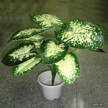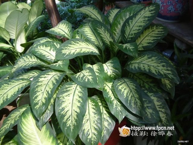 學 名: Dieffenbachia picta 別 名: 黛粉葉 科 屬: 天南星科花葉萬年青屬 類 別: 多年生常綠草本 莖干粗壯多肉質,株高可達1.5米。葉片大而光亮,著生于莖干上部,橢圓狀卵圓形或寬披針形,先端漸尖,全緣,長20-50厘米、寬5-15厘米;寬大的葉片兩面深綠色,其上鑲嵌著密集、不規(guī)則的白色、乳白、淡黃色等色彩不一的斑點,斑紋或斑塊;葉鞘近中部下具葉柄;üS扇~梢中抽出,短于葉柄,花單性,佛焰花序,佛焰苞呈橢圓形,下部呈筒狀。 其園藝品種甚多,不同的品種葉片上的花紋不同。 我國常見栽培的有: 大王黛粉葉:葉面沿側脈有乳白色斑條及斑塊。 暑白黛粉葉:濃綠色葉面中心乳黃綠色,葉緣及主脈深綠色,沿側脈有乳白色斑條及斑塊。 白玉黛粉葉:葉片中心部分全部乳白色,只有葉緣葉脈呈不規(guī)則的銀色。 產地分布 : 原產于美洲熱帶地區(qū)。 19世紀60年代傳入英國,很快遍及歐洲、美洲和大洋洲。至今,全世界廣泛栽培,其栽培品種很多,已進入千家萬戶。目前,美國的赫梅特國際公司、艾格艾貿易公司、奧格爾斯比植物實驗中心,荷蘭的亨克·布拉姆公司、門·范文公司,以色列的本澤苗圃、卡梅爾公司和澳大利亞的伯班克(Burbank)生物技術公司等都是世界上生產花葉萬年青的著名公司,許多優(yōu)良名種來自上述公司。這些公司從選育新品種、繁殖、生產和貿易形成一體化、產業(yè)化,在世界花葉萬年青的生產上都占有很大份額。 我國花葉萬年青的栽培時間不長。雖然20世紀50年代已引種,但規(guī)模性生產從20世紀80年代以后才開始。至今,花葉萬年青在城市中到處可見,普及率還在不斷提高。 生長習性 : 花葉萬年青性喜高溫高濕、半陰或陰蔽環(huán)境。 生長適溫為20-30℃,如冬季溫度低于8℃,澆水過多,會引起落葉和頂莖漬爛。 夏季莖葉生長旺盛期每天澆水外,應多次向葉面噴水,并每月施肥1次,注意遮陰。 冬季盆土保濕即行,放室內陽光充足處。 栽培養(yǎng)護: 它在生長過程中,在莖基部分蘗出小植株。春末夏初可將這些小植株切下插于粗沙中,保持濕潤,十幾天就會發(fā)根,即可上盆種植。盆栽兩年以的植株由于莖干較長可結合整形修剪進行繁殖?捎4-5月將莖干在土面2-3節(jié)處剪斷,母本植株仍可發(fā)芽。剪下的莖干,約10厘米長的頂部可直接作插穗,將葉束卷,切口也可用水苔包扎,然后插入苗床;莖中部的2-3節(jié)剪成一莖段(5-6厘米),橫埋于粗沙或蛭石培成的苗床上,保持25-30℃溫度及一定濕度。經2-3周,即可生根長芽。由于花葉萬年青莖干多汁,扦插時剪口要稍晾干(或用草木灰等沾傷口)后插入苗床,以免插穗腐爛。值得一提的是,花葉萬年青切口分泌的汁液含有對人體有害的草酸和天門和冬素等,剪切時必須注意皮膚勿被枝汁液沾染,以免發(fā)生皮炎或過敏癥。 花葉萬年青栽培時求排水性良、疏松、肥沃的砂質壤土,一般盆栽可用2份腐葉土、1份園土和1份河另加少量腐熟基肥混全作為基質。在生長季,為促使其旺盛生長,要以寧濕勿干為澆水原則,給予較充分澆水,同時輔以葉面噴水。秋后開始控制水分,盆土以見濕為度;冬季則應適當保持盆土干燥,過濕會引起落葉。 特別提醒: 它耐肥力強,養(yǎng)分充足,生長迅速;但施肥過多,特別是氮肥太多,易使葉面斑紋不清晰,所以要適量。一般生長季每月可施稀薄液肥或復合肥1-2次,冬季則停止施肥。 用途: 花葉萬年青綠色的葉面上有白色或黃色的斑點,色調鮮明,是良好的室內觀葉植物.