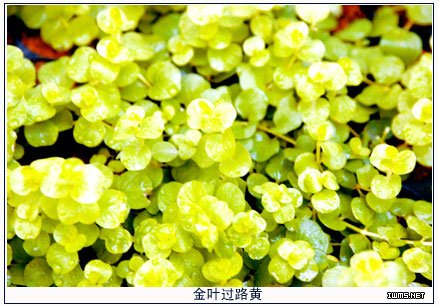 學 名: Lysimachia nummularia ‘Aurea’ 特征: 金葉過路黃植株高約5~7cm,具豐富的地表匍匐莖(匍匐莖最長時可達到1m以上), 多年生,常綠,株高約5厘米,枝條匍匐生長,可達50~60厘米,單葉對生,圓形,基部心形長約2厘米,早春至秋季金黃色,冬季霜后略帶暗紅色;夏季6~7月開花,單花,黃色尖端向上翻成杯形,亮黃色,花徑約2厘米。 最適生長溫度15~30℃;花期5~7月,開杯狀黃花。 生長習性: 金葉過路黃喜光、耐熱、耐旱、耐寒,在武漢地區栽培能露地越冬。 。從2月下旬開始發葉生長,3月份葉片綠色轉黃色,以后隨著氣溫升高及光照的增強,生長速度明顯加快,從一個芽點長到20公分的匍匐枝條只需二十多天,葉色也由黃色漸漸地轉為金黃色,覆蓋力相當強,枝葉鋪滿地面時,雜草難于生長。 夏季耐干旱。病蟲害又少。立秋后,天氣轉冷,金葉過路黃葉色金黃未褪。到11底植株漸漸停止生長,葉色,由金黃色慢慢轉淡黃,直至綠色。在冬季濃霜和氣溫在-5℃時葉色還轉為暗紅色。 繁殖技術: 金葉過路黃全年均可繁殖,以無性繁殖為主。繁殖苗床土壤要疏松、肥沃且排水性能良好,以砂壤土與草炭土混合配制為佳。筆者分別在2002年10月5日、12月27日和2003年3月12日、5月10日、6月15日、7月3日、8月1日及9月9日等時間內對金葉過路黃進行了分株穴栽、壓條及切莖撒播等方法的繁殖試驗,均取得了不同程度的成功,其繁殖成活率都比較理想,繁殖系數也較高。 管理技術: 金葉過路黃是一種非常優良的耐粗放管理的彩葉地被,具有較強的耐干旱能力。在完全覆蓋地面以后,金葉過路黃植株會表現出很強的簇擁疊生性狀,它的抗雜草能力相當強,能夠抑制如空心蓮子草、香附子、天胡荽等惡性雜草的入侵。因此,在栽培管理中雜草的防除工作量較少。另外,金葉過路黃因為對土壤的適應性強,耐干旱,在正常情況下常規管理即可。 推廣應用前景: 金葉過路黃可廣泛用作園林色塊、綠化隔離帶及地被植物栽植,具有耐旱、耐熱、耐寒、耐粗放管理、葉色優美、繁殖快速的特點,其優雅亮麗的地被景觀是馬蹄金、白三葉等草坪地被植物所無法取代的。在上海、杭州等城市,金葉過路黃已經逐漸成為園林綠化中地被植物的新寵。隨著武漢地區城市園林綠化的快速發展,金葉過路黃作為一種新優的園林彩葉地被植物,值得在武漢市的城市園林綠化中得到廣泛的栽培應用。 用途: 園林綠地應用中可以和草坪及其他綠色地被相配,金黃色十分耀眼,大大豐富城市景觀。