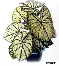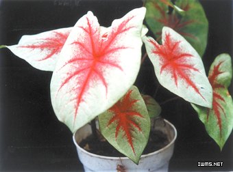 學(xué) 名:Caladium hortulanum 別 名:花葉芋 科 屬:天南星科彩葉芋屬 產(chǎn)地: 原產(chǎn)巴西 形態(tài)特征: 花葉芋為多年常綠生草本。地下具膨大塊莖,扁球形。基生葉盾狀箭形或心形,綠色,具白、粉、深紅等色斑,佛焰苞綠色,上部綠白色,呈殼狀。 葉子從塊莖上長出,為卵形或,心形,色彩變化萬千。有紅脈鑲綠,紅脈綠葉,紅脈帶斑,綠脈紅斑,有的葉色純白而僅留下綠脈或紅脈,有的綠色葉面布滿油漆或水彩狀斑點(diǎn)。 夏季是它的主要觀賞期,葉子的斑斕色彩充滿著涼意。人秋葉漸零亂,冬季葉枯黃,進(jìn)入休眠期,到春末夏初又開始萌芽生長。5—9月是它的旺盛生長期。 花葉芋葉形似象耳,色彩斑斕,艷麗奪目,是觀葉植物中的上品。 生長習(xí)性: 喜高溫、高濕和半陰環(huán)境,不耐低溫和霜雪,要求土壤疏松、肥沃和排水良好。 彩葉芋適溫20—30℃,夜間不低于10℃,休眠期保持10℃,不喜強(qiáng)光,蔭蔽度30—40%。 它喜粘質(zhì)土壤,多以粘質(zhì)田土五份、腐葉土二份與砂三份混合配制而成。 秋季葉黃不要拔起,扶正支撐好,給予充足的陽光、肥料,使球根肥大,直到葉全部自然枯黃,才停止?jié)菜?a href="http://plant.m.kstxie.cn" target="_blank" title="植物">施肥。 到翌年春季分塊莖繁殖。自然分株是將塊莖旁的小球分離栽培,人工分株是將大塊莖切割成若干塊,每塊必須有芽眼,另行栽植。 繁殖方法: 以分株繁殖為主,4月將塊莖周圍的小塊莖剝下,晾干數(shù)日,直接盆栽。也可在塊莖開始抽芽長葉時,用刀切割帶芽塊莖,待切面干燥愈合后栽植。 彩葉芋在遮光栽培方面,依其不同品種、遮光程度而有顯著之差異。植株高度及葉片長度、寬度以遮光80%者為較大,分 數(shù)則以遮光40%者為多,但品種不同稍有差異。不同塊莖切塊數(shù)及藥劑處理對植株之影響,依塊莖繁殖之切塊數(shù)、藥劑處理種類、品種等不同而有顯著差異。切塊最少者,始葉之日數(shù)短,植株較高,葉片數(shù)及分 數(shù)多,葉長及葉寬較大。利用Mancozeb(80%WP)處理者產(chǎn)生之分 數(shù)較之用Benomyl(50%WP)者為多。 用途: 除作盆栽觀賞,裝飾居室外,南方可露地在居室沿墻周圍栽植。