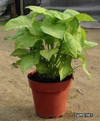 學(xué) 名: Syngonium podophyllum 別 名: 箭葉芋,白蝴蝶 科 屬: 天南星科合果芋屬 類 別: 常綠藤本植物 常綠藤本植物,蔓性強(qiáng),莖部常有氣生根。 葉大有長(zhǎng)柄,葉形變化較多,葉子在幼齡期和成熟期的形狀不同:幼齡期的新葉呈箭頭狀或朝形,而成熟的老葉則是3裂或5裂的掌狀葉(掌狀葉多至9—1J1裂);近葉基之裂片左右兩側(cè),常有小型耳垂?fàn)钚∪~;葉脈內(nèi)葉基至葉端整齊而平行伸展,形成緣脈。 產(chǎn)地分布 : 原產(chǎn)中美、南美熱帶地區(qū) . 生長(zhǎng)適溫為22~30℃,在15℃時(shí)生長(zhǎng)較慢,10℃以下則莖葉停止生長(zhǎng)。冬季溫度在5℃以下葉片出現(xiàn)凍害。春季氣溫超過(guò)10℃時(shí)合果芋開(kāi)始萌發(fā)新芽,隨著溫度的升高,莖葉速度逐步加快。 合果芋喜濕怕干。夏季生長(zhǎng)旺盛期,需充分澆水,保持盆土濕潤(rùn),以利于莖葉快速生長(zhǎng)。每天增加葉面噴水,保持較高的空氣濕度,葉片生長(zhǎng)健壯、充實(shí),具有較好的觀賞效果。水分不足或遭受干旱,葉片粗糙變小。 合果芋對(duì)光照的適應(yīng)性較強(qiáng)。在明亮的光照下,葉片較大,葉色變淺。在半陰條件下,葉片變小,葉色偏深。但長(zhǎng)時(shí)間在低光度情況下,莖干和葉柄伸長(zhǎng),株形松散,葉片變小。合果芋生長(zhǎng)的適度光照為1.5萬(wàn)~3.0萬(wàn)勒克斯,即夏季需遮蔭70%~80%,冬季遮蔭40%~50%。 土壤以肥沃、疏松和排水良好的砂質(zhì)壤土為宜。盆栽土以腐葉土、泥炭土和粗沙的混合土。同時(shí),合果芋也非常適合無(wú)土栽培。 常見(jiàn)品種: 箭頭合果芋(Albelineatum),幼葉箭形,掌狀3裂,葉綠色,葉脈兩側(cè)呈銀白色,成熟葉深綠色。 白紋合果芋(Albo-virens),幼葉狹長(zhǎng)箭形,淡綠色,向內(nèi)趨于淡白色,葉緣寬綠色。 粉蝶合果芋(PinkButterfly),葉盾形,淡綠色,中部淡粉色。 銀葉合果芋(SilverKnight),葉心形,葉面乳白色帶淺黃,葉緣綠色,葉柄長(zhǎng)。 翠玉合果芋(Variegata),葉箭形,綠色,具不規(guī)則白色斑塊,葉柄短。 白蝶合果芋(WhiteButterfly),葉盾形,淺白色,葉緣具綠色條塊和斑紋,葉柄長(zhǎng)。