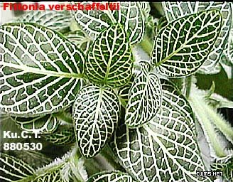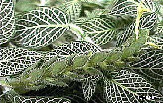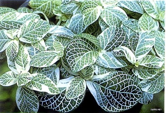 學名:Fittonia verschaffeltii var.argyroneura 科屬:爵床科費通花屬 種類: 常見的網紋草有三種,一種叫紅網紋草,另一種叫白網紋草,第三種為小葉白草。 產地: 原產秘魯. 小葉白網紋草是1984年從意大利引人我國的。經三年試種,可成為我國適合室內培植的觀葉植物。 形態特征: 小葉白網紋草株高約20厘米,單葉為橢圓形,葉片紙質,呈十字對生,葉端、葉基均為鈍圓,莖枝、葉柄、葉背中肋皆密布毛茸,葉面上布有白色的網脈,非常好看。 白網紋草是標準的室內植物,在室內時她是有如生龍活虎般的生命力,第一次觸摸到她的時候絕對被她葉片與莖節的堅硬程度嚇一跳,有如木本植物單的硬度,可是放到室外不消多久,立刻就軟化下來,根據園藝店的說明,是因為水分的流失,這立刻讓我們想起含羞草的莖能夠萎縮閉合,其間的因素就是在莖節中的水分膨脹壓力的關係,水分愈多的狀況之下白網紋草的硬度愈硬,相對的水分如果減少的話,整株植物就會軟化下來。 花與花序: 盛夏時花都著生於莖頂,開黃色小花,為穗狀花序,不容易結子,往往都是靠扦插繁殖,挑選莖幹堅硬的部分,塗抹上些生長激素,只要水分適當以及光照不強都能夠很快的繁演出下一代。 莖節間的莖毛: 白網紋草的莖上面都有許多細毛,摸的感覺非常柔軟,這個特點可以用來鑑別白網紋草與其他椒草類植物的不同。 生長習性: 忌陽光直射,只能在蔽蔭高溫的環境中生長。生長適溫25-30℃,越冬溫度應在12℃以上。喜通透性良好的疏松土壤。 小葉白網紋草不要放在直射光下,并注意通風,因其喜好高溫,不可低于15℃(一般有暖氣家庭都可以種植)。由于葉為紙質,要注意葉片的清潔,不要沾上盆土和肥料。小葉白網紋草喜淡的有機成無機液肥。盆土要排水良好。在生行期需要修剪、摘心,使植株布滿全盆,若引導枝條向盆外垂,即可以形成吊盆。 白網紋草和冷水草都屬多年生常綠草本植物,但前者屬爵床科植物,后者為蕁麻科植物。都喜高空氣濕度,半陰環境生長,均是理想的室內觀葉植物。不同的是白網紋草喜20~30℃高溫生長,冬季低于15℃則死亡,耐寒力差;且葉薄,根系細密,不耐干旱,也怕積水。而冷水花喜涼爽環境,較耐寒,冬季夜間溫度只需保持5℃以上,即可生長良好;且葉莖肉質,較耐干,土壤要求一般,管理粗放。 應用: 白網紋草小巧玲瓏,是案頭、茶幾、書桌上之佳品。