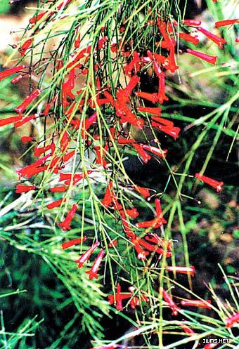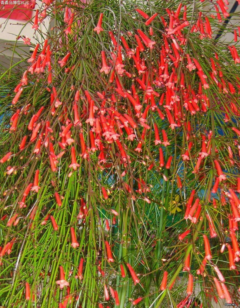 學名: Crossandra pungens 科屬: 玄參科、爆竹花屬 產地:原產中美洲 形態: 多年生常綠草本植物,株高約 1米,纖細的莖枝呈綠色,有縱棱,具分枝多數,分枝在節處輪生。小葉對生或輪生,除個別的葉片呈卵圓形外,大部分葉子都退化成小鱗片。圓錐狀聚傘花序,花萼淡綠色,花冠長筒形,紅色,先端為不明顯的兩唇形,上唇2裂,下唇3裂,5月至8月為盛花期。 爆竹花的花朵多開在嫩枝上,且耐修剪,故栽培中要經常修剪,以促使多發嫩枝,既能保持植株的優美,又可達到多開花的目的。 爆竹花的筒狀花酷似點火欲燃的鞭炮,盛開于翠綠而纖細的枝條上,給人以喜慶熱烈的感覺。可盆栽或吊盆栽種,裝飾陽臺、庭院或懸掛于廊下,效果都不錯。 習性: 喜溫熱,不耐寒,要求排水良好、疏松肥沃的土壤。溫室栽培越冬最低溫度12℃。 栽培中要盡可能地多接受陽光的照射,即是盛夏,也不必遮光。怕水澇,稍耐旱,澆水做到見干見濕,既不能長期積水,也不能過于干旱。空氣干燥時可向植株噴水,以增加空氣濕度。生長期每10天左右施一次腐熟的稀薄液肥或復合肥。 冬季放在室內陽光處,節制澆水,停止施肥,8℃以上可安全越冬。每年春季換盆一次,盆土宜用疏松肥沃,且排水透氣性良好的沙質土壤,可用腐葉土2份、園土和沙土各1份混合后使用,并摻入少量腐熟的餅肥作基肥。 爆竹花的花朵多開在嫩枝上,且耐修剪,故栽培中要經常修剪,以促使多發嫩枝,既能保持植株的優美,又可達到多開花的目的。