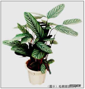 形態(tài)特征: 株高60厘米至90厘米。莖匍匐生長(zhǎng),葉柄細(xì)長(zhǎng)似蘆葦,葉片披針形,銀白色,中脈及葉緣銀綠色,在中脈兩側(cè)排列有長(zhǎng)短交替的銀綠色斑紋,其長(zhǎng)的斑紋與葉緣相連,葉背紫色。 大多數(shù)品種具有地下根莖或塊莖,葉片除基部有開放的葉鞘外,在葉片與葉柄連接處,還有一顯著膨大的關(guān)節(jié),稱為“葉枕”,其內(nèi)有貯水細(xì)胞,有調(diào)節(jié)葉片方向的作用,即晚上水分充足時(shí)葉片直立,白天水分不足時(shí),葉片展開. 生長(zhǎng)習(xí)性: 毛柄銀羽竹芋屬于熱帶植物,喜溫暖濕潤(rùn)和光線明亮的環(huán)境,不耐寒,也不耐旱,怕烈日暴曬,若陽光直射會(huì)灼傷葉片,使葉片邊緣出現(xiàn)局部枯焦,新葉停止生長(zhǎng),葉色變黃,因此栽培中要注意遮光。 培植養(yǎng)護(hù): 但生長(zhǎng)環(huán)境也不能過于蔭蔽,否則會(huì)造成植株長(zhǎng)勢(shì)弱,某些斑葉品種葉面上的花紋減退,甚至消失,最好放在光線明亮又無直射陽光處養(yǎng)護(hù)。竹芋對(duì)水分反應(yīng)較為敏感,生長(zhǎng)期應(yīng)充分澆水,以保持盆土濕潤(rùn),但土壤不宜積水,否則會(huì)導(dǎo)致根部腐爛,甚至植株死亡。 由于竹芋葉片較大,水分蒸發(fā)快,因此對(duì)空氣濕度要求較高,若空氣濕度不夠,葉片會(huì)立刻卷曲,反應(yīng)十分靈敏,猶其是新葉生長(zhǎng)期,更應(yīng)經(jīng)常向植株噴水,否則會(huì)因空氣干燥導(dǎo)致新葉難以舒展、葉緣枯焦發(fā)黃、葉小無光澤,天鵝絨竹芋等品種的葉片無絨質(zhì)感,嚴(yán)重影響觀賞,因此室內(nèi)栽培空氣濕度必須保持在70%至80%。 為了美觀,可經(jīng)常用干凈的軟布蘸清水擦洗葉片,以使葉片明亮,具有光澤。盛夏當(dāng)氣溫超過35℃時(shí)對(duì)葉片生長(zhǎng)不利,應(yīng)注意通風(fēng)、噴水進(jìn)行降溫,使植株有一個(gè)涼爽濕潤(rùn)的環(huán)境。春末夏初是新葉的生長(zhǎng)期,每10天左右施一次腐熟的稀薄液肥或復(fù)合肥,夏季和初秋每20天至30天施一次肥,施肥時(shí)注意氮肥含量不能過多,否則會(huì)使葉片無光澤,斑紋減退,一般氮、磷、鉀比例為2 ∶1∶1,以使葉色光亮美麗,具有較高的觀賞價(jià)值。 冬季溫度低于15 ℃時(shí)植株停止生長(zhǎng),若長(zhǎng)時(shí)間低于13℃葉片就會(huì)受到凍害,因此越冬溫度最好不低于13℃,并多接受光照,停止施肥,適當(dāng)減少澆水,保持盆土不干燥即可,等春季長(zhǎng)出新葉后再恢復(fù)正常管理。 每隔一年換盆一次,盆土宜用疏松肥沃、排水透氣性良好,并含有豐富腐殖質(zhì)的微酸性土壤,可用腐葉土或草炭土加少量的粗沙或珍珠巖混合配制。 繁殖: 大部分品種竹芋的繁殖可結(jié)合換盆進(jìn)行分株,分株時(shí)注意要使每一分割塊上帶有較多的葉片和健壯的根,新株栽種不宜過深,將根全部埋入土壤即可,否則影響新芽的生長(zhǎng)。 新栽的植株株要控制土壤水分,但可經(jīng)常向葉面噴水,以增加空氣濕度,等長(zhǎng)出新根后方可充分澆水。若大量繁殖,還可用組培法。