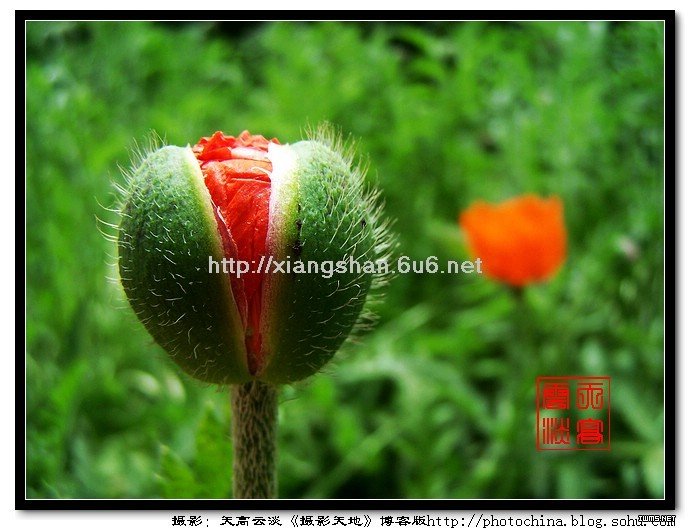 學名: Papaver orientale 別名: 火花罌粟 科屬: 為罌栗科、罌栗屬 種類:多年生常綠草本 形態特征: 株高90--lOOcm。莖直立粗壯,基部不分枝,全株被疏生長自茸毛,莖有乳汁。葉互生羽狀深裂。 花單生,花苞橢圓形卵狀,含苞時花蕾下垂。萼片2枚早落,花瓣基部有紫黑色斑,花徑約15crn,有粉、紫、橙紅、白及重瓣品種,花期5月中旬,單花可開4~5天。蒴果成熟時孔裂。 它和罌粟不同,就是蒴果內不含嗎啡類麻醉性的生物堿。 產地: 原產伊朗至地中海地區。 生態習性: 喜陽光充足和通風良好的環境,耐寒、忌雨澇。 宜疏松肥沃、排水良好的砂質土。 東方罌粟于8月下旬至9月都可播種,甚至10至11月也可播種,2周出苗,3-4葉間苗,株行距20-30厘米。 因幼苗為直根系,不耐移栽,播時最好用小花盆或營養缽育苗,于3-4葉脫盆下地,耐霜,但嚴冬葉片逐漸枯萎,來春返青后,隔二周追肥一次,使植株健壯,花大色艷。 到5月中旬至6月,它長出下垂的花蕾,初開時向上伸直,先呈杯狀,后漸向外開張,單花壽命4-5天;ㄖx后,它的子房迅速長成直徑3-4厘米的蒴果,月余果熟,內有種子數千粒。 定植時, 植株需帶土。較耐寒,在華北地區多有栽培,具直根,不耐移植。定植后每年應及時追肥、除草和松土。 園林用途: 東方罌粟以植株秀麗,花朵輕盈,花型別致,花姿優美,色澤艷麗而著名,在園林應用上有較高的觀賞價值,是良好的花境背景材料。 適宜于籬旁、路邊條植或片植,也可叢植于草坪中央,或植于野生花卉周圍。 盆栽裝飾環境能起到絢麗奪目的觀賞效果。 若作切花,可在花蕾微裂顯色時剪下,立即置于水中防止乳汁從莖枝巾流出,可保證適時開花,并延長花期。