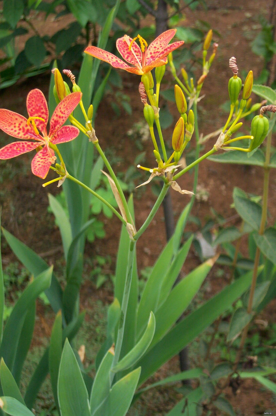 學名:Belamcanda chinensis 別名:扁竹,螞螂花 科屬:鳶尾科 種類: 多年生草本 產地:分布于湖北、河南、安徽等20多個省、區. 生長習性: 喜陽光、溫暖、耐干旱、耐寒,野生于山坡、曠地、河谷和荊棘叢中。 射干雖喜干旱、耐嚴寒,但在出苗期和定苗朗需澆水。保持田間濕潤,幼苗高達10厘米時可不澆水。雨季應注意排水,防止田間積水而造成爛根。 植物特征 : 高50~120cm。根狀莖橫生,略呈結節狀,外皮鮮黃色,生多數須根。莖直立,下部生葉。葉2列,嵌迭狀排列,寬劍形,扁平,長25~60cm,寬2~4cm,綠色,常帶白粉,基部抱莖,葉脈平行。聚傘花序傘房狀頂生;總花梗和小花;烤吣べ|的苞片, 花桔黃色,直徑3~5cm,花被片 6,橢圓形,長2~2.5cm,寬約 1cm,散生暗紅色斑點,內輪 3片較外輪 3片略小,基部合生成短筒,雄蕊3,著生在花被片基部;子房下位,3室,花柱棒狀,頂端 3淺裂,被短柔毛。 蒴果倒卵圓球形,長2.5~3.5cm,有 3縱棱,成熟時沿縫線 3瓣裂。種子黑色,近球形,有光澤。 花期7~9月,果期8~9月。 性味與歸經:苦,寒。歸肺經。 功能與主治: 清熱解毒,消痰,利咽。 于熱毒痰火郁結,咽喉腫痛,痰涎壅盛,咳嗽氣喘。 貯藏: 置干燥處。 采收加工: 射干在生長2年后(種子繁殖需2年,根莖繁殖只需1年)的寒露時刨收。將刨出的根莖去掉莖桿和項根,洗凈曬干即可出售。 射干不但入藥,而且還是名貴花卉,是外貿出口產品。 近年由于采挖過度,致使資源日漸緊缺。因此,發展射干生產是農家脫貧的一條好門路。一般畝產干藥可達200至250千克。