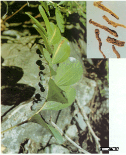 學名: Polygonatum odoratum 別名: 尾參、 玉參、萎蕤、鈴鐺菜 科屬: 百合科玉竹[Polygatum odoratum (Mill)Druce.] 形態特征: 多年生宿根草本,株高30厘米~60厘米。 地下具竹鞭狀肉質根狀莖。根莖地下橫生,呈壓扁狀圓柱形,表皮黃白色,斷面粉黃色。莖單一,上部稍斜,具縱棱、光滑無毛,綠色。葉互生,葉片橢圓形,先端鈍尖,基部楔形,全緣,上面綠色,下面粉綠色。花l~3朵,腋生.花梗俯垂,綠白色;花被筒狀,頂端6裂,裂片卵圓形;雄蕊6,著生于花被筒中部;子房上位。漿果球形,成熟時暗紫色。種子卵圓形,黃褐色,無光澤。 花期5~7月,果期7~9月。 根據報狀莖的形態主要分為兩種:小玉竹和大玉竹。 小玉竹俗稱竹根尾,地下莖瘦小,給節小,節間長,分布較廣,品質較差,食用價值低。 大玉竹俗稱豬屎尾,地下莖粗壯,結節較大,節間較長,分枝較多,品質好,食用價值高。根狀莖含生物堿,強心甙(為鈴蘭甙,鈴蘭苦甙),糖類(為葡萄糖、果糖、阿拉伯糖)、黏液、煙酸和維生素等。 生長特性: 玉竹對環境條件適應性較強,對土壤條件要求不嚴,但宜生長在濕潤的地方。一般溫度在9C~13C,根莖出苗,18C~22C時現蕾開花,19C~25C地下根莖增粗。 種子上胚軸有休眠特性,低溫能解除其休眠,胚后熟需25C 80天以上才能完成。如要使種子正常快速發育,必須先將種子置 25C條件下后熟 80~100天,然后置0C~5C條件下一個月左右,再移至室溫下,就可正常發芽。但生產上一般不用種子繁殖。種子壽命為2年。 采收與加工: 一般于栽后2~3年,于8月中旬采挖。選雨后晴天土壤稍干時,用刀齊地將莖葉割去,然后用齒耙順行挖根,抖去泥沙,按大小分級,放在陽光下曝曬3~4天,至外表變軟,有粘液滲出時,置竹簍中輕輕撞去根毛和泥沙,繼續晾曬至由白變黃時,用手搓擦或兩腳反復踩揉。如此反復數次,至揉軟光滑、無硬心,色黃白時,曬干即可。也可將鮮玉竹用蒸籠蒸透,隨后邊曬邊揉,反復多次,直至軟而透明時,再曬干。 用途: 以根入藥。性平、味甘。具有養陰清熱、生津止咳等功效。醫學上用作滋補藥品,主治熱病傷陰、虛熱燥咳、心臟病、糖尿病、結核病等癥,并可作高級滋補食品、佳肴和飲料。 應用: 玉竹莖葉挺拔,5-6月開花,花白色,鐘形下垂,清雅可愛。宜用于花境或林緣作觀賞地被植物,也可盆栽觀賞。 栽培玉竹經濟效益十分可觀,是農民生產致富的一條好門路。玉竹產量很高,2年生玉竹一公頃最高可產75000千克,一般可產45000千克;3年生玉竹一公頃最高可產12O000千克,一般可產75000千克。 處方用名: 玉竹,炙玉竹,肥玉竹,葳蕤,萎蕤。 來 源:為百合科植物玉竹的根莖。 商品規格:以條長、肥壯、色黃白者為佳。 用法用量:內服:煎湯,6-9g;熬膏或入丸、散。 1、治食管癌: 南沙參、玉竹、天冬各15g,旋覆花3g,山藥24g,白茅根60g,白花蛇舌草120g。加水2.5Kg,慢火熬至500ml左右,去渣后蜂蜜于藥汁中熬和。日一劑,分4次服。忌發物、煙酒和房事。 同時以輔用下法: (1)白鵝斷頸,口含鵝頸,飲其熱血,5-7日一次。 (2)將白鵝尾毛燒炭,研極細末,分三次,用米湯送服。 2、治肺癌: 寧宮、蜈蚣各5條,干蟾皮、山海螺、徐長卿、玉竹、葶藶各30g,茯苓皮、庵 子各15g,甘草10g,蛤蚧1對。水煎服,每日1劑,飯后服。 3、治鼻咽癌痛: 白茅根12g,黨參12g,天冬、麥冬各12g,沙參、生地、茯苓各10g,元參、銀花、玉竹各9g,白花蛇舌草30g,白毛藤30g,丹參15g,甘草3g,水煎服,每日1劑,代茶飲用。