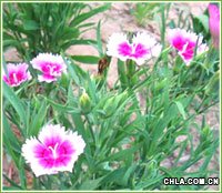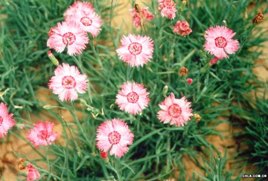 別名: 地被石竹 科屬: 石竹科石竹屬 產地: 原產奧地利、西伯利亞 形態特征: 常夏石竹是多年生宿根草本植物,節膨大,單葉對生,株高l0-15cm,四季常綠,三季開花。 生長習性: 適應性廣,抗嚴寒(可抗零下35℃的低溫),耐干旱瘠薄(每月只需澆1次水,很少施肥),花很美(盛開期花朵可覆蓋地面),對土壤酸堿度要求也不十分嚴格(pH值介于5-8之間的土壤均可種植),分生、分化能力強,繁殖容易,生長迅速。 用途特征: 常夏石竹的根系龐大,可防止土壤沖刷和水土流失,并能抗有害氣體和病蟲害,有重要的衛生環保功能。可作為園林的重要組成部分,也可栽培于庭院內外、公路兩旁、風景觀光地帶,以及露天活動和休息場地,不僅具有較好的美化、綠化作用,還具有較強的觀賞性。目前常見的草坪多是細葉苔草、狗牙根、地毯草等。 春、夏、秋三季鮮綠,冬季枯黃,不開花,缺乏耐寒性、抗逆性、美觀性和持久性。如結合本地資源特點及市場優勢,引種常夏石竹,形成規模化生產,逐步更新現有劣質草坪,可產生較大的社會效益. 常夏石竹整體觀感如早熟禾類草坪,是布置花壇、花境及大面積鋪種的極好材料。由于常夏石竹花期長,花色艷,三季開花,四季常青,加之耐旱,耐寒,近幾年被廣泛引種。夏季由于溫度高,雨水偏多,石竹根部極易腐爛。 栽培養護: 耐干旱、瘠薄,因此澆水時間,次數應根據天氣干旱情況及土壤墑情、靈活用水,在水分管理上,掌握寧干勿濕的原則,如久旱無雨,天氣干旱,可適當增加澆水次數。梅雨季節或大雨過后,應注意排水,以防草坪積水,苗木被淹死. 既抗旱又耐瘠薄,澆水次數多少應根據墑情而定,一般情況每年必澆2次水,第1次為返青水,初春,石竹苗剛開始返青時澆水1次;第2次為花期水,5月中旬,常夏石竹進入盛花期,澆水一次;第3次是封凍水,澆水一次以利石竹安全越冬。新栽苗要特別注意第一遍要澆足澆透,然后隔3--5d,視天氣及土壤干旱情況再澆1--2次。