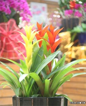 學名:Neoregelia carolinae 別名:美艷鳳梨、赫鳳梨、斑葉紅心鳳梨等 科屬:鳳梨科彩葉鳳梨屬 形態: 一種株型奇特、色彩斑斕、小巧玲瓏的新穎觀葉花卉。彩葉鳳梨株高25~30厘米,扁平的蓮座狀,葉叢外張,葉片寬而薄,長20~30厘米,寬3~4厘米,綠色的葉片上染有古銅色,有光澤。葉緣有細鋸齒,葉中央有寬幅乳白至乳黃色縱紋,葉叢中央的葉片在開花前逐漸轉變為粉紅色而后又變為鮮紅色,鮮艷悅目。蓮座狀植株中心抽出的花序,或明若火炬,或狀似絨球。花呈白、藍、紫等色交相輝映。 大多于春季開放,花色顯得既熱情奔放又端莊大方,是近年來頗流行的觀葉花卉新寵。 產地: 原產于南美熱帶地區. 本屬在國內的栽培品種約有20多個,常見的栽培品種有三個: 美艷鳳梨,株高25~30厘米,葉片寬而薄,表面有光澤,葉長20~30厘米,寬3~4厘米,邊緣具細鋸齒,花序上的小花呈淡紫色,觀賞期長達6~12個月。 金邊鳳梨,株高30厘米,每株葉片10~20枚,平展如碟狀;葉長20~30厘米,寬3~4厘米,革質而有光澤,橄欖綠色,葉緣有黃、白色鑲邊,不少葉片中央具有不規則的紋;植株中心的葉片在開花時漸變為紅色,小花紫色,苞片先端白色,觀賞價值極高。 艷美鳳梨,株高30~35厘米,葉寬3~3.5厘米,銅綠色,背面白粉狀,葉基部帶紫色,先端鈍且有紅色小尖頭,夏、秋季節開藍色花。 用途 :室內盆栽