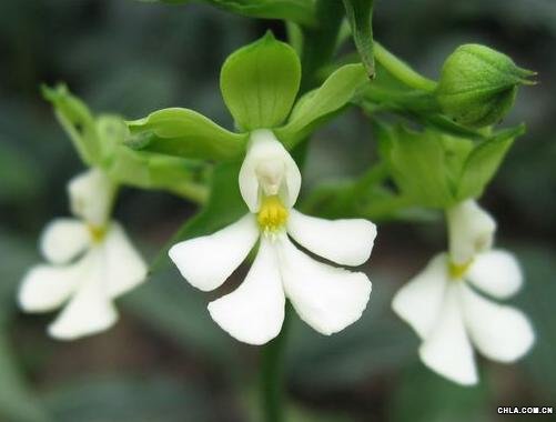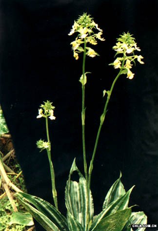 學名:Calanthe argenteo-striata 科屬: 蘭科 該屬植物約250種,中國有50種,分布于亞洲熱帶亞熱帶。 形態特征: 植株無明顯的根狀莖。假鱗莖粗短,近圓錐形,粗約1.5厘米,具2—3枚鞘和3— 7枚在花期展開的葉。葉上面深綠色,帶5--6條銀灰色的條帶,橢圓形或卵狀披針形, 長18--27厘米,寬5—11厘米,先端急尖,基部收狹為長約3--4厘米的柄,無毛或背 面稍被短毛。花葶從葉叢中央抽出,長達60厘米,密被短毛,具3--4枚筒狀鞘;總狀 花序長7—11厘米,具10余朵花;花苞片寬卵形,長約1.5厘米,先端急尖,背面被毛. 花梗和子房黃綠色,長約3厘米;花張開;萼片和花瓣多少反折,黃綠色;中萼片 橢圓形,長9毫米,寬4.5毫米,先端鈍并具短芒,具5條脈,背面被短毛;側萼片寬 卵狀橢圓形,長10毫米,寬5.5毫米,先端鈍并具短芒,具5條脈,背面被短毛. 花 瓣近匙形或倒卵形,比萼片稍小,先端近截形并具短凸,具3條脈,無毛;唇瓣白色, 與整個蕊柱翅合生,比萼片長,基部具3列金黃色的小瘤狀物,3裂;側裂片近斧頭 狀,長和寬均7毫米,先端近圓形;中裂片深2裂;小裂片與側裂片等大;距黃綠色, 細圓筒形,長1.5—1.9厘米,向末端變狹,外面疏被短毛;蕊柱白色,長約5毫米; 蕊喙2裂,軛形;藥帽白色、前端收狹,先端喙狀;花粉團狹倒卵球形或狹棒狀,近等 大,長約2毫米,具短的花粉團柄,粘盤近方形。 花期4--5月。 產地分布: 產廣東北部(從化)、廣西西南部(龍州)、貴州西南部(興義、安龍)和云南東南 部(金平、麻栗坡)。 生于海拔500—1200米的山坡林下的巖石空隙或覆土的石灰巖面上。