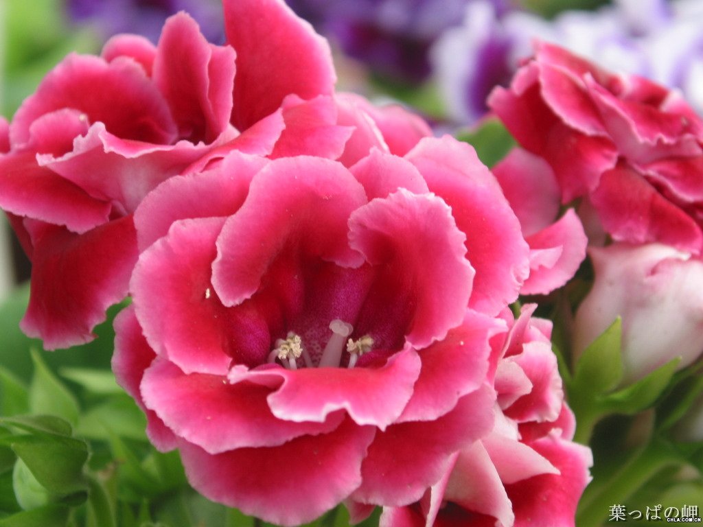 大巖桐為多年生草本。塊莖扁球形。葉對生,肥厚而大,密生茸毛。花朵鐘狀,色彩豐富,大而美麗。大巖桐的栽培品種繁多,花色有藍、粉紅、白、紅、紫等,還有白邊藍花、白邊紅花雙色和重瓣花。 重瓣大巖桐(Gloxinia-double),主要有錦花系列和神秘系列。錦花系列的重瓣率達90%以上,是目前重瓣率最高的系列。株高15cm,花徑8cm,此系列品種最為暢銷。神秘系列的重瓣率60%左右,株形較矮,開花較早,有粉紅、紫色等。此系列價格較便宜。 單瓣大巖桐(Gloxinia-single),主要有燦爛系列、花神系列和迷你系列。燦爛系列的主要花色有混色、藍色、紅色白邊、緋紅色,花期較其他品種早10天。花神系列的主要花色有櫻桃紅、紫紅、淡紫色、西瓜粉、紅絲絨、白絲絨。迷你系列的主要花色為混色。 常見品種: 威廉皇帝(EmperorWilliam),花深紫色,具白邊。挑戰(Defiance),花深紅色。弗雷德里克皇帝(EmperorFrederick),花紅色白邊。瑞士(Switzerland),花褶紅色。泰格里納(Tigrina),花橙紅色。另外,還有火神(VulcanFire)、格雷戈爾·門德爾(GregorMendel).赫巴·奧塞納(HebaOsena)、維納斯(Venus)等。重瓣種有芝加哥重瓣(DoubleChicago),花淡橙紅色,重瓣。巨早(EarlyGiant)系列,花色有深紫具淡紫邊、深紅等,開花早,從播種至開花只需4個月。重瓣錦緞(DoubleBrocade),花有深紅、紅色具紫色花心和白邊、玫瑰紅具白邊、深紅具深紫色花心等,矮生,重瓣花,葉片小。 常見同屬觀賞種: 細小大巖桐(S.pusilla),屬迷你型大巖桐,花淡粉紅色,其品種有白鬼怪(Whitesprite),花白色;小娃娃(DollBaby),花淡紫色。王后大巖桐(S.regina),花淡紫紅色。優雅大巖桐(S.concinna),花淡紫色,喉部白色。還有長葉大巖桐(S.speciosavar.macropHylla)和雜種大巖桐(S.hybrida)。