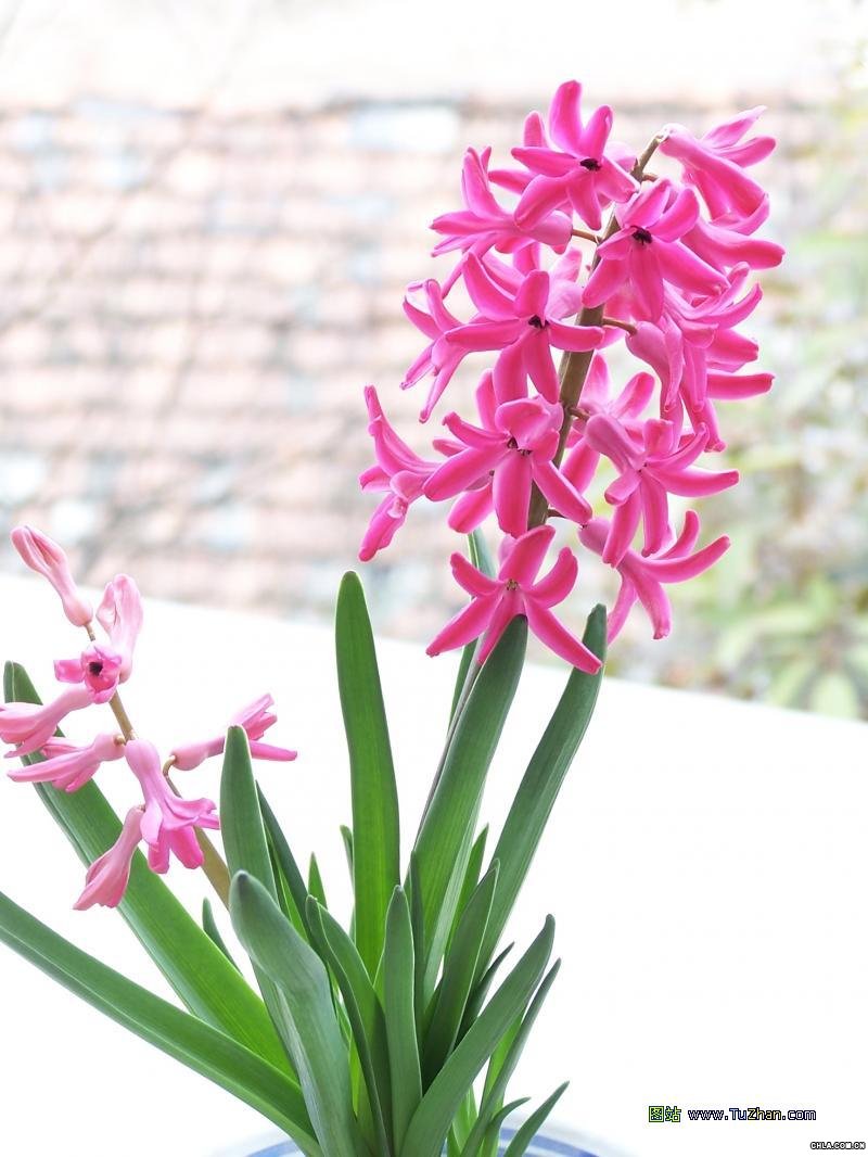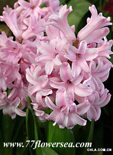 學名:Hyacinthus orientalia 別名:洋水仙、五色水仙 科屬:百合科風信子屬 形態特征: 風信子為多年生草本。鱗莖卵形,有膜質外皮。葉4~8枚,狹披針形,肉質,上有凹溝,綠色有光澤。花莖肉質,略高于葉,總狀花序頂生,花5~20朵,橫向或下傾,漏斗形,花被筒長、基部膨大,裂片長圓形、反卷,花有紫、白、紅、黃、粉、藍等色,還有重瓣、大花、早花和多倍體等品種。 風信子花序端莊,色彩絢麗,在光潔鮮嫩的綠葉襯托下,恬靜典雅,是早春開花的著名球根花卉之一,也是重要的盆花種類。 產地及分布: 風信子原產東南歐、地中海東部沿岸及小亞細亞一帶。 風信子在歐洲最早栽培,1596年英國已將風信子用于庭園栽培。18世紀開始在歐洲已廣泛栽培,并已進行育種。至今,荷蘭、法國、英國和德國將風信子的生產推向產業化。其中荷蘭生產量最大,1995年風信子盆花的產值為1220萬美元,列荷蘭盆花生產的第十九位。荷蘭的菲托諾瓦(Phytonova)公司是風信子育種、生產和貿易的主要基地。 至今,風信子已在世界各地廣泛栽培,需求量逐年上升。 我國栽培風信子始于19世紀末,主要在沿海的大城市,栽培不普遍。20世紀50年代開始,各地植物園和公園才有少量栽培,用于花壇觀賞。直到80年代以后,風信子才在全國各地有較大的發展,廣泛用于春季花卉展覽和盆栽銷售。至今,栽培風信子已開始進入家庭和公共場所的室內點綴和擺放,需求量逐年增加。 生長習性: 喜涼爽、濕潤和陽光充足環境。鱗莖有夏季休眠習性,秋冬生根,早春萌發新芽,3月開花,6月上旬植株枯萎。鳳信子在生長過程中,鱗莖在2~6℃低溫時根系生長最好。芽萌動適溫為5~10℃,葉片生長適溫為10~12℃,現蕾開花期以15~18℃最有利。鱗莖的貯藏溫度為20~28℃,最適為25℃,對花芽分化最為理想。 花粉紅色的安娜·瑪麗(AnnaMarie)早花種,德比夫人(LadyDerby)中花種,馬科尼(Marconi)晚花種,粉珍珠(PinkPearl)早花種,軟糖(Fondante)和粉皇后(QueenofthePinks)晚花種。 花紅色的阿姆斯特丹(Amsterdam)和簡·博斯(JanBos)極早花種。 花白色的卡內基(Carnegie)晚花種,英諾森塞(LInnocence)早花種,白珍珠(WhitePearl)早花種。 花藍色的大西洋(Atlantic),巨藍(BlueGiant)大花、早花種,藍衣(BlueJacket)晚花種,藍星(BlueStar)和彩藍(DelftBlue)早花種。 花深藍色的瑪麗(Marie)晚花種,奧斯塔雷(Ostara)早花種。 花紫色的紫晶(Amethyst)晚花種,安娜·利薩(Lisa)早花種和紫珍珠(VioletPearl)。 花橙色的吉普賽女王(GipsyQueen)。花黃色的哈萊姆城(CityofHaarlem)晚花種。