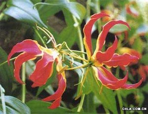 嘉蘭具橫走的根狀莖,直徑約2cm,淡黃褐色,常由頂芽出苗。地上莖細柔,蔓生,高達3m,綠色,直徑不到1cm,不分枝或有少數(shù)分枝。葉無柄,互生、對生或3枚輪生,卵形至卵狀披針形,翠綠色,先端漸細成尾狀,頂端卷須狀,藉以卷纏它物而使莖向上生長。 花兩性,單生或數(shù)朵著生于頂端組成疏散的傘房花序。花大色艷,直徑達10cm-15cm,花被片6,離生,上部紅色,下部黃色,條狀披針形,向上反曲,邊緣皺波狀。7至11月間陸續(xù)開放,每朵花可開10-11天,每株花可開約55天。蒴果。 嘉蘭的花瓣開始為綠色翻卷成龍爪形,次日花瓣中部變成黃色,瓣尖為鮮紅色,瓣周鑲嵌金邊,3天后,花莖部、中部分別由綠色、黃色變成金黃、橙紅直到鮮紅。整株花期可以延續(xù)55天。 喜溫暖、濕潤氣候及富含有機質(zhì),排水、通氣良好,保水力強的肥沃土壤,在密林及潮濕草叢中生長良好。忌干旱和強光,幼苗期需40%-45%陰蔽度,營養(yǎng)生長期、花期內(nèi)需10%-15%的陰蔽度,土壤濕度保持在80%左右。生育期降雨量以1000-1200mm為宜,要求空氣相對濕度80%以上。 耐寒力較差,當(dāng)氣溫低于22℃時,花發(fā)育不良,不能結(jié)實;低于15℃時,植株地上部分受凍害。生長適溫為22℃-24℃。一般于3月萌發(fā)生長,6月中旬始花,7-8月為盛花期,9-10月為種子成熟期 常見同屬觀賞種有: 寬瓣嘉蘭(G.rothschildiana),葉寬披針形,花被闊披針形,反卷,邊緣有時波狀,花瓣橙紅色,基部金黃色。產(chǎn)于熱帶非洲。自第3-4節(jié)起在其先端生長卷須,葉序不規(guī)則,15-20片葉對生、互生或輪生。 卵圓嘉蘭(G.virescens),葉卵圓形,花紅或黃色,瓣邊不皺。產(chǎn)于熱帶非洲。 卡森嘉蘭(G.carsonii),花瓣寬,紫紅色,邊緣檸檬黃色。 格林嘉蘭(G.greeneae),花瓣寬,平展,鮮黃色。 弗斯科里(G.verschurii),花瓣寬。邊緣皺褶少,橙紅色基部邊黃色。 栽培品種有金黃嘉蘭(g.superba cv.Aurea),花瓣螺旋形,橙紅色。孔雀,中型花,直徑8-12cm,深紅色帶橘黃邊;莖蔓性;葉濃綠色披針形。 變種:大花嘉蘭(var.grandiflora)。