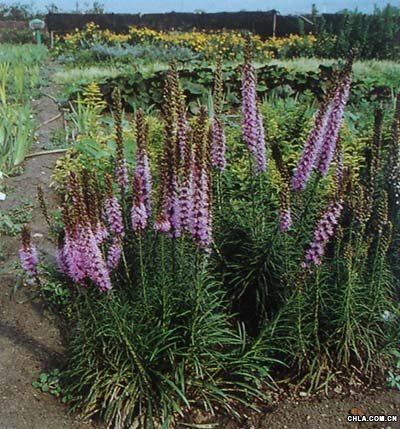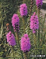 學名:Liatris ligulistylis 科名:菊科 別名:蛇鞭菊 麒麟菊 原產地:北美洲 特性: 球根花卉。性喜溫暖的氣候,耐旱力強,卻喜吸收水分。株高1-2米,花呈穗狀,花序排列長達15-30公分,穗上各花毯狀如薊,色紫紅,極能持久,姿色珍奇可愛,為插花的好材料。 育苗: 播種于排水良好的砂床或砂質土壤,保持濕度,可發芽成苗,經肥培越冬后再行移植。冬季休眠期掘取成株完整塊根塊根極堅硬不易分切。 栽培要點: 發芽適溫:20℃ 生長適溫:20-25℃ 播種期:春至秋季 開花期:夏末秋初 春季2-4月間將塊根種植,經3-4個月的栽培而成開花株。栽培土質以疏松而排水良好之砂質壤土或壤土為佳,定植前整地宜混合堆肥作基肥,生育期間每月再施用三要素追肥1次。灌水宜充足,經常保持土壤濕度,生育良好。盆栽宜用8寸以上大盆。
