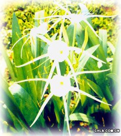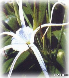 學名:Hymenocallis americana 別名:美洲水鬼蕉、水鬼蕉 科屬:多年生球根花卉 形態特征: 葉劍形,端銳尖,多直立,鮮綠色,長50-80cm,寬3-6cm。花葶扁平,高30-70cm;花白色,無梗,呈傘狀著生;有芳香;花筒部長短不一,15-18cm,帶綠色;花被片線狀,一般比筒部短;副冠鐘形或闊漏斗形,具齒牙緣。 鱗莖徑7一11cm。 蜘蛛蘭的名稱大概是由其花朵的性狀而來的,其花瓣細長,且分的很開,酷似蜘蛛的長腿,而花朵中間的部分則可被看作是蜘蛛的身體。和很多蘭花一樣,蜘蛛蘭的拉丁名也是來源于希臘語,蜘蛛蘭的拉丁名Arachnis就是由希臘語arachne演化而來的,其意思就是蜘蛛。 蜘蛛蘭屬中有些種為附生蘭,有些則為巖生蘭,還有的物種可算是藤本植物,若沿著支柱可攀爬到四五米高。其實,這也是蜘蛛蘭的生理特性所決定的,蜘蛛蘭喜陽光,攀爬的越高,就越有利于獲得充裕的光照。除了喜陽光,蜘蛛蘭對濕潤的氣候也十分偏好,在天氣炎熱的情況下,經常給蜘蛛蘭噴水,會給它創造出非常理想的生長環境。 蜘蛛蘭的花朵一般比較大,花瓣厚而覆蓋著蠟質,一般為黃綠色到黃色,并分布著一些褐色或紫褐色的斑點。花瓣一般是細長的,在頂端多會有向下的彎曲。蜘蛛蘭的花序是總狀的,常常生長著很多花朵。其葉片一般生長在莖的兩側,排列很整齊,有時葉片尖端會裂成兩片。 在育種師手中,蜘蛛蘭常常被用以同萬代蘭進行雜交,從而培育出更具觀賞價值的新品種。 產地及分布: 原產美洲,蜘蛛蘭屬大約有17?20個物種,大多分布于東南亞和大洋洲,如菲律賓、緬甸、馬來西亞、巴布亞新幾內亞等國家的熱帶叢林中。 生長習性: 光照、溫暖濕潤,不耐寒;喜肥沃的土壤。盆栽越冬溫度15℃以上。 生長期水肥要充足。 露地栽植于秋季挖球,干藏于室內。