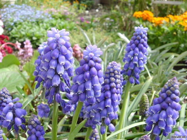 學名:Muscari botryoides 別名:藍壺花、葡萄百合、葡萄麝香蘭 科屬:百合科藍壺花屬 形態特征: 葡萄風信子是從歐洲引進的優良觀花地被,為百合科藍壺花屬多年生草本植物。小鱗莖卵圓形,葉絨狀披針形,叢生,植株矮小。花莛高15至20厘米,頂端簇生10至20朵小壇狀花,整個花序猶如藍紫色的葡萄串,秀麗高雅。花期4至5月。 葡萄風信子原產歐洲中部的法國、德國及波蘭南部。 生長習性: 性喜溫暖、涼爽氣候,喜光亦耐陰,適生溫度15℃至30℃,宜于在疏松、肥沃、排水良好的砂質壤土上生長。 繁殖方法: 葡萄風信子一般采用播種或分植小鱗莖繁殖。種子采收后,可在秋季露地直播,次年4月發芽,實生苗3年后開花。分植鱗莖可于夏季葉片枯萎后進行,秋季生根,入冬前長出葉片。夏季休眠,冬季葉片常綠,抗寒性較強,在北京地區僅葉端枯黃。葡萄風信子適應性強,栽培管理容易,隨時可移植,亦能用于冬季促成栽培。8月底將鱗莖放入6℃至8℃的冰柜內冷藏50天,然后取出置在冷室通風處,12月初用種菊花的花盆栽植,每盆放8至12個種球。在15℃至25℃養護,元旦、春節便能開花,可作為室內垂吊盆花。葡萄風信子可用作林下地被,亦可用于花壇鑲邊或布置花境,別具情趣。