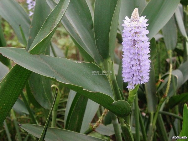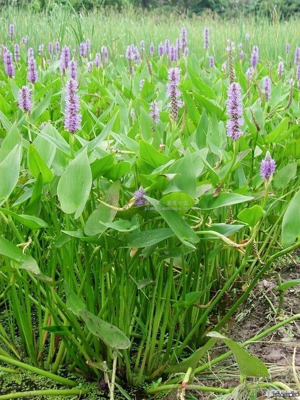 學(xué)名: Pontederia cordata L. 別名: 北美梭魚草 系多年生挺水草本植物。 根莖為須狀不定根,長(zhǎng)15-30cm,具多數(shù)根毛。地下莖粗壯,黃褐色,有芽眼,地莖葉叢生,株高80-150cm。葉柄綠色,圓筒形,橫切斷面具膜質(zhì)物。葉片光滑,呈橄欖色,倒卵狀披針形。葉基生廣心形,端部漸尖。 穗狀花序頂生,長(zhǎng)5-20cm,小花密集在200朵以上,藍(lán)紫色帶黃斑點(diǎn),直徑約10mm左右,花被裂片6枚,近圓形,裂片基部連接為筒狀。果實(shí)初期綠色,成熟后褐色;果皮堅(jiān)硬,種子橢圓形,直徑1-2mm。 花果期5-10月。 原產(chǎn)北美。如今已在我國(guó)安家落戶。喜溫暖濕潤(rùn)、光照充足的環(huán)境條件,常栽于淺水池或塘邊,適宜生長(zhǎng)發(fā)育的溫度范圍為18-35℃,18℃以下生長(zhǎng)緩慢,10℃以下停止生長(zhǎng),冬季必須進(jìn)行越冬(灌水或移至室內(nèi))處理。 繁殖方法 : 采用分株法和種子繁殖,分株可在春夏兩季進(jìn)行,自植株基部切開即可,種子繁殖一般在春季進(jìn)行,種子發(fā)芽溫度需保持在25'C左右。 梭魚草可直接栽植于淺水中,或先植子花缸內(nèi),再放入水池,栽培基質(zhì)以肥沃為好,對(duì)水質(zhì)沒有特別的要求,但盡量沒有污染,有條件的話可在春秋兩季各施一次腐熟的有機(jī)肥。肥料需埋八土中,以免擴(kuò)散到水域從而影響肥效。 梭魚草葉色翠綠,花色迷人,花期較長(zhǎng),可用于家庭盆栽、池栽,也可廣泛用于園林美化,栽植于河道兩側(cè)、池塘四周、人工濕地,與千屈菜、花葉蘆竹、水蔥、再力花等相間種植,每到花開時(shí)節(jié),串串紫花在片片綠葉的映襯下,別有一番情趣。