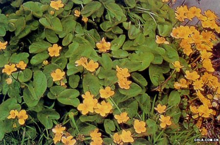 學名:Cenetlla asiatica(l.)urban minor(Blume)Sherff 科屬:豆科 產地: 原產我國南方各省 類別: 挺水性植物 生長習性: 性喜溫暖潮濕,栽培處以半日照或遮陰處為佳,忌陽光直射,栽培土不拘,以松軟排水良好的栽培土為佳,最適水溫22~28度。 耐陰、耐濕,稍耐旱,適應性強。 形態特征: 莖細長,節處生根。葉圓形或腎形,背面密被貼生丁字形毛,全緣;花冠鐘狀黃色. 花期4月。果期7月,蒴果近球形。播種和分株法繁殖,蔓延能力很強,為優良的地被植物。 銅錢草生性強健,種植容易,繁殖迅速,水陸兩棲皆可。 走莖發達,節間長出根和葉。葉圓形盾狀,具長柄、波浪緣,夏秋開小小的黃綠色花。 用途: 根莖葉可以當蔬菜料理;亦可當中藥材來袪風、固腸、明目清暑等。