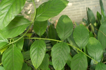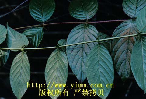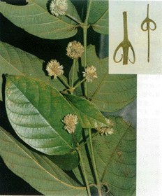 學名:Uncaria sersilifractus roxb. 科屬:茜草科 別名: 倒掛金鉤、雙鉤、長梗鉤藤, 童疊 植物形態: 小枝四棱柱形,節上有毛;葉腋有鉤狀變態枝,鉤長1.5~2.5cm,幼時被毛,老時光滑。單葉對生,薄革質,橢圓形至倒卵狀矩圓形,基部短尖或鈍,上面光滑,下面稍帶粉白色。頭狀花序生于葉腋或枝頂,總花梗中部或中部以下著生4~6枚苞片;花5數,花冠白色或淡黃色,僅裂片外面被絹毛。蒴果紡錘形。花期6~7月,果期10~11月。 分布生境:分布于思茅等地。 藥用部位:帶鉤莖枝。 采收加工: 秋、冬二季采收,去葉,切段,曬干。 性味歸經: 甘,涼。歸肝、心包經。 功能主治: 清熱平肝,息風定驚。用于頭痛昡暈,感冒夾涼,驚癇抽搐,妊娠子癇,高血壓。 除上述正品鉤藤外,尚有大葉鉤藤Uncaria macrophylla Wall.,毛鉤藤U.hissuta Havil.,華鉤藤U. sinensis Havil.,(U. membranifolis How)以及無柄果鉤藤U. sessilifructus Roxb.等的帶鉤莖枝也常一并使用。 1. 大葉鉤藤: 莖枝呈方柱形,直徑1.1~5mm。表面灰棕色至棕色。兩側有較深的縱溝,被褐色毛,尤以節部及鉤端多,鉤長1.7~3.5cm,與莖著生成(120)~130~140°角,鉤向內深彎成長圓形或圓形,末端膨大成小球,斷面髓部多中空。顯微鑒別:莖(直徑3mm)橫切面:四方形,木質部兩側向內呈弧狀突出,表皮角質層具紋理。表皮具單細胞及多細胞非腺毛,長70~874μm,常可見螺狀紋理,皮層外側為3~4列色素細胞層,中柱鞘纖維連接成環,韌皮部厚約57μm,射線不明顯。髓部中央有空隙。皮層內側細胞含有草酸鈣砂晶及簇晶。大葉鉤藤的葉含鉤藤堿、異鉤藤堿、去氫鉤藤堿A及去氫鉤藤堿B。 2. 毛鉤藤: 莖枝梢呈方形或近似圓柱形,直徑2~5mm。表面灰棕色或稍呈灰白色,粗糙,被褐色毛。鉤長1.4~2cm,與莖著生120°~130°(140°)角,幾成三角狀。顯微鑒別 莖(直3mm)橫切面:方形,表皮細胞角質層較厚,約4~7μm,復表皮細胞2~5層,排列整齊,外層表皮具單細胞毛,常成鉤狀彎曲,長133~678μm,多細胞毛由2~15個細胞組成,長133~678μm。皮層細胞含草酸鈣砂晶。毛鉤藤的葉含帽葉堿(mitraphylline)及其氧化物(N-oxide),異帽葉堿(isomitraphylline)及其氧化物(N-oxide),恩卡林堿甲(uncarine A)及恩卡林堿乙(uncarine B)。 3. 華鉤藤: 莖枝呈方柱形,直徑2~5mm。表面黃棕色或黃綠色。鉤長約1.3~2.8cm。鉤與莖著生成130~140°角,彎曲成長圓形。顯微鑒別 莖(直徑2.5mm)橫切面:方形,表皮細胞角質層厚約5μm。表面平滑,無毛;皮層的色素細胞淡棕色,中柱鞘纖維成環,韌皮部厚約150μm,韌皮部內纖維較少。皮層及韌皮薄壁細胞內有草酸鈣砂晶。本種的葉含翅果定堿(pteropodine)、異翅果定堿(isopteropodine)、麗葉堿(speciophylline)、恩卡林堿F及它們各自的氧化物(N-oxides)。 4. 無柄果鉤藤(白鉤藤): 莖枝呈方柱形,直徑1.2~4mm。表面棕黃色,四面均有一縱溝。被褐色柔毛,以節部及鉤端較多,鉤長1.3~1.8cm,鉤與莖著生成110~130°角,彎曲部較圓,向內深旋,斷面黃白色。顯微鑒別 莖(直徑3mm)橫切面:方形,木質部向內呈弧狀突出,使髓部略呈"十"字形。表皮細胞角質層厚約4~8μm,表面觀及橫切面觀可見不規則波狀紋理。表皮細胞外側平周壁常稍向外突出,細胞略呈半圓形。表皮毛較多,多數為單細胞短角狀毛,表面疣狀突起,毛長20~50μm。多細胞毛較少,毛由3~5個細胞組成,長130~240μm。皮層不含色素層,有較多的細胞內含草酸鈣簇晶及砂晶。皮層內側為3~7列斷續成環的石細胞層。解離組織中,石細胞窄長方形,長50~128μm,寬13~40μm,胞腔及孔溝明顯。中柱鞘纖維十數個成束,排列成環。韌皮射線明顯,單列,大型,含黃色素。葉含鉤藤堿、異鉤藤堿、克諾辛堿、克諾辛堿B及毛鉤藤堿。