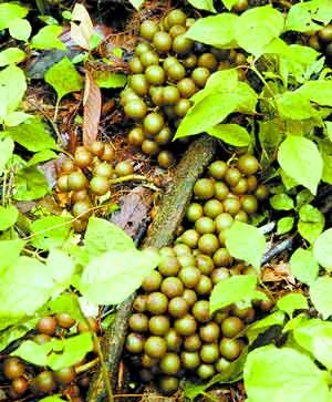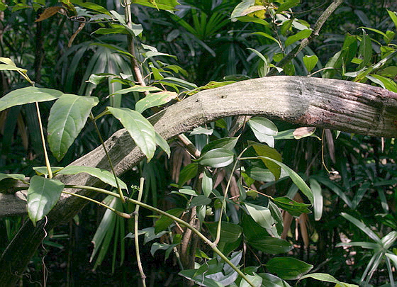 學名: Tetrastigma planicaule 科屬: 葡萄科 別名: 扁藤、大蘆藤、鐵帶藤、過江扁龍、扁骨風、腰帶藤、羊帶風 應用: 以全株入藥。全年可采,洗凈切片曬干。 得名原因: 因其形似扁擔而得名。 形態特征: 它是一種常年生的植物,通常纏繞在樹干上,藤長約5-6m,藤面呈灰白色,葉色深綠,葉面寬約3-4cm,呈橢圓形,比一般樹葉稍厚。砍斷藤子后,可以看到條條小筋的斷痕,并很快就會流出可供飲用的清水。 生活在西雙版納的傣族獵人進山,一般不帶水壺,就靠這種天然水壺中的清水解渴。 用途: 扁擔藤是天然水壺,能噴出泉水,幫助人們解渴。 來源: 葡萄科崖爬藤屬植物扁擔藤Tetrastigma planicaule (Hook. f.) Gagnep. 采收:藤莖根可入藥,全年均可采收,夏季采葉曬干備用。 性味歸經: 辛、澀,溫. 功能主治: 祛風除濕,舒筋活絡。用于風濕骨痛,腰肌勞損,跌打損傷,半身不遂。 用法用量: 1~1.5兩。水煎或浸酒服。