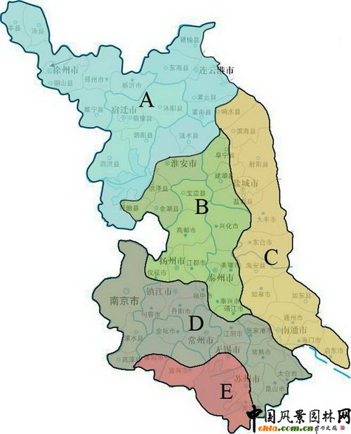 蘇中江淮平原、低地城鎮區(包含揚州、泰州和淮安3市以及周邊縣(市)) 骨干樹種:落羽杉Taxodium distichum 、池杉Taxodium ascendens 、女貞Ligustrum lucidum 、垂柳Salix babylonica 。 基調樹種:樸樹Celtis sinensis 、榔榆Ulmus parvifolia 、櫸樹Zelkova schneideriana 、廣玉蘭Magnolia grandliflora 、七葉樹、銀杏Ginkgo biloba 、楓香Liquidambar formosana 、欒樹Koelreuteria bipinnata var. integrifoliola 、烏桕Sapium sebiferum 、三角楓Acer buergerianum 、旱柳Salix matsudana 、楓楊Pterocarya stenoptera 、懸鈴木Platanus acerifolia 、薄殼山核桃Carya illinoensis 、雪柳Fontanesia fortunei 。 特征樹種:耐水淹樹種選擇是該地區的特色,有濕地松Pinus elliottii 、池杉、落羽杉、中山杉、楓楊、日本榿木、河柳Salix chaenomeloides 、垂柳Salix babylonica 、木芙蓉、白蠟Fraxinus chinensis等;垂柳和瓊花、芍藥分別是揚州的市樹市花,銀杏和梅花是泰州的市樹市花,雪松和月季是淮安的市樹市花,可以作為各自城市的特征樹種。 一般樹種:本地區一般園林樹種達500余種。