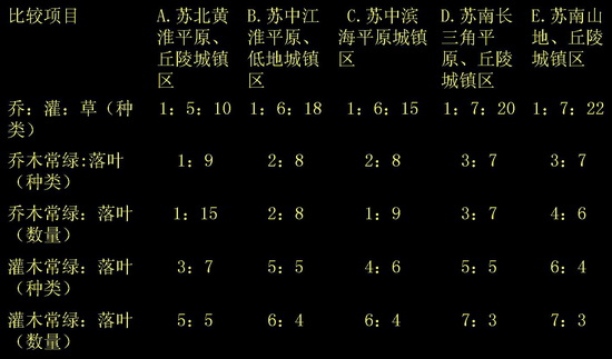 江蘇省5個城市園林區劃單元不同生態習性樹種配置參考比例