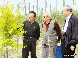 5月22日,在金葉欒的擴繁基地——北京順義的一片苗圃地里,眾多資深學者專家對新品種金葉欒作了詳細的考察,并對這一新品種作出高度評價。中國科學院植物所研究員董保華認為,金葉欒是由普通欒樹產生芽變而選育出的欒樹新品種,它嫩梢為紅色,葉片為鮮艷的金黃色,由于欒樹分枝點多,樹型也十分漂亮,我國北方顏色這么漂亮的彩葉樹非常之少,有這樣一個漂亮的彩葉樹種問世,非常難得。中國科學院植物所研究員張治明說,我國過去從國外引進不少彩葉樹種,一些種樹出現了諸多問題,如復葉槭蟲害多,顏色、樹型都沒有金葉欒漂亮。北京林業大學張志毅教授認為,金葉欒是從鄉土樹種欒樹中選育出來的,它具有欒樹本身有的耐寒、耐旱、病蟲害少、抗逆性強、適應性廣等多種優良特性,有很大的推廣價值。中國林木種子公司副總經理羅寧對金葉欒的市場前景極為看好,他說,金葉欒葉片顏色穩定,全年都為金黃色,十分少見。金葉欒不管是做行道樹或是做盆景都十分適宜。金葉欒作為我國特有的彩葉新品種,有可觀的出口前景。 金葉欒從開始選育到今天準備推向市場已歷時8年時間。2000年,對新品種選育情有獨鐘的山西苗農王國棟在深山老林中采種時,發現一棵野生欒樹葉子是金黃色的,他采用這株金葉欒樹上的枝條進行嫁接、培植出金葉欒新株,后又不斷對嫁接新植株一代代的觀察,選擇,經過多年反復的嫁接繁育,欒樹葉色金黃的特性一代代地穩定了下來。 把金葉欒推向園林綠化市場是苗農王國棟多年的夢想。然而,資金能力有限,個人勢單力薄,為推廣金葉欒,王國棟多年歷盡艱辛。所幸,2006年王國棟找到了北京嘉泰麗景苗木公司經理石居寶作為推廣金葉欒的合作伙伴,他們在北京順義開始了新品種金葉欒的繼續觀察研究與擴繁工作。 為規模化繁育新品種金葉欒,近年來王國棟與他的合作者石居寶不斷地探求金葉欒籽播、組培、扦插、嫁接等繁殖方法。試驗有成功也有失敗,其中積累了許多有價值的經驗,并取得一定成果。 在我國北方,色彩亮麗的喬木樹種非常匱乏,金葉欒顏色金黃,顏色亮麗絢爛,并且是鄉土樹種,適宜種植在有欒樹分布的中國北部及中部,隨著金葉欒的規模化繁育,逐步走向市場,它將為我國北方園林造景增添寶貴的資源。 圖1王國棟在向學者專家介紹他培育的金葉欒。
